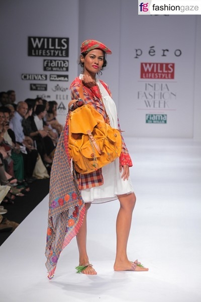 The designer’s signature style of ‘relaxed chic’ got a print and colour makeover. The costumes were injected with ditzy floral prints with red, blue and yellow as the dominant colors. Red prints on blue jacket reconfirmed the loud colour story. Models borne resemblance to hippie chic, beautifully styled in gypsy headscarves with abundance of prints and checks, sunglasses, straw hat and cute vegetable basket – a secure similitude to Indianised beachwear. Checks of all forms including Madras checks, gin gham and Scottish tartans in shades of red, white and grey were teamed with hand-made wire baskets.