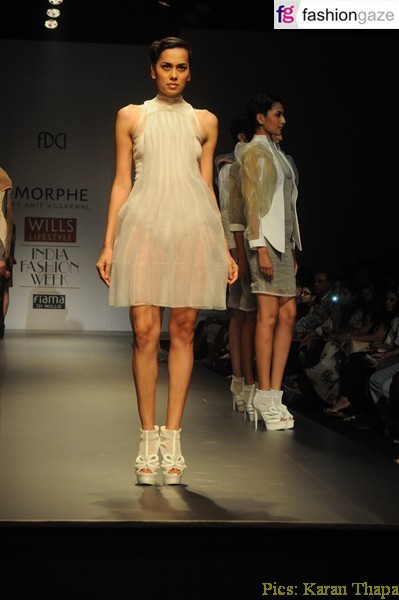Scarlet and PrussianDesigner duo Ankur and Priyanka Modi created a range of chic and sophisticated flouncy dresses in eye-popping scarlet red and prussian blue that were swinging and bouncing their way down the ramp. A beige satin jumpsuit with notched collar and gathered sleeves inaugurated the show followed by a beige dress with prints until a scarlet red trouser styled with binoculars on the waist gave a twist to the story. Red and blue dazzled down the ramp with hints of sequins and prints. Floor-sweeping maxi dresses were styled with elegant waist belt. Maxi dresses were constructed out of delicate sheer chiffon fabric with high slits and asymmetric hemlines. Abstract prints were splashed on jumpsuits and shift dresses with see-through peasant sleeves. Adding to the glamour was a body hugging top complimenting a draped skirt with huge side slit. The show also offered a variety of wrap and baby-doll dresses. Full skirted dresses, shorts, sharply tailored jumpsuits and tapered trousers kept the entire look chic, alluring and wearable.