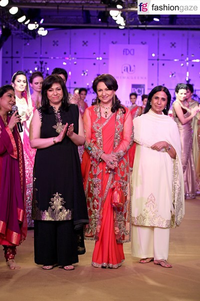 Gorgeous actress Sharmila Tagore walked the ramp as a show stopper and enthralled the crowd with their adoring beauty. Replying to the question that why she walked at Ashima –Leena show. She said,” I liked Ashima –Leena and her collection. Her collection is very nice. She also added ,that my favourite colour is Tomato red.