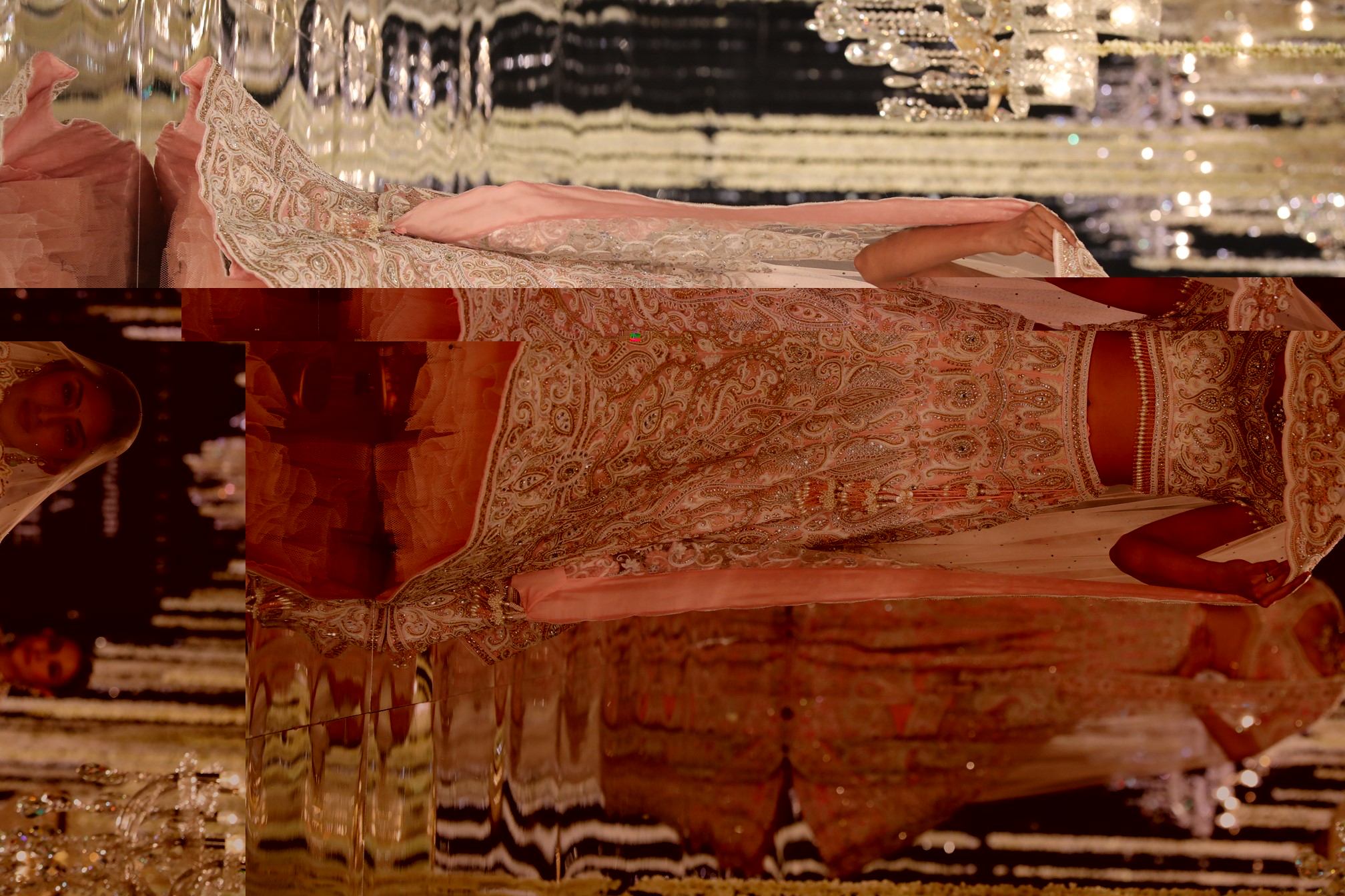 The assortment includes enormous dynamic moulded mirrors embellished with multi-hued string weaving, offering a contemporary interpretation of marriage wear. The impressive lehengas, with off-shoulder shirts and short coats, grandstand dull shades of 12 PM blue and burgundy, supplemented by silver accents. Hung skirts worn with capes and unsettled organza shirts matched with high-waisted palazzo pants total the gathering.