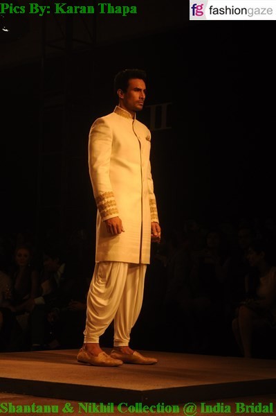 The show started with soft pristine white ensembles like gowns, lehengas, mermaid dresses, anarkalis in dull gold floral embroidery work especially at the hems and borders. A long fitted dress with intricate gold embroidery and with wispy flowy tulle fabric was a real stunner. Another, one off shoulder gown in tulle and with embroidery in similar fashion was layered with a toga like style on one side. A soft camel colour anarkali with empire waist line was also mind captivating because of its simplicity and softness. Peplum tops over long skirts like lehengas in earthy colours also mesmerised the audiences. There was extensive use of soft flowy fabrics in earthy colours and hence indicating the monochromatic hues for which Shantanu and Nikhil are always known to incorporate in their collection. Other star attractions of the collection were the peplum jackets with bundcollar and floor sweeping lehengas. The appearance of gold leaf and booti patterns, was used moderately to portray women delicate yet classier. The male models also showcased sherwanis with soft but intricate gold work with similar pattern embroidery at the pocket of the sherwani. Dhoti pants teamed with sherwanis also attracted attention towards the Shantanu and Nikhil’s men collection. Eye-catching attire which formed part of the men’s collection was a deep red toga –like short kurta teamed with similar colour fitted paijamis.