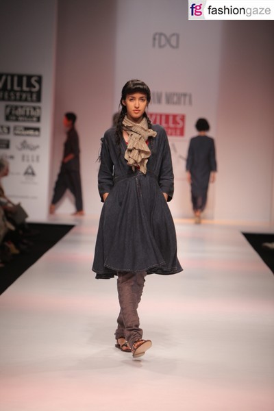 Merging bold kantha stitch with flawed elements was a masterstroke by the designer. Models clad in raw and rustic garments in beige and dull blue were styled with elegant footwear in nutmeg shade. Artful interpretation of damage, aged and weathered made the collection fresh, simple, modest and humble.