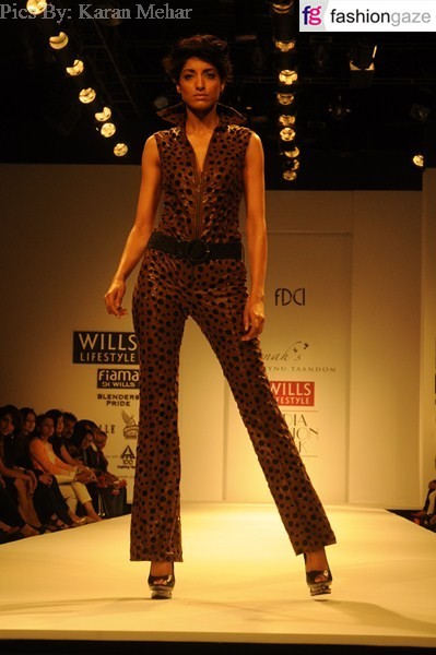 The collection comprised of dresses, gowns, jackets tunics and tops. The colours used in the collection were black, beige, brick as the base tinted with selections from a multicoloured palate that serve as the highlights . Material used ranged from French chiffons, cotton lycra, embroidered georgettes, leathers to satin nets.