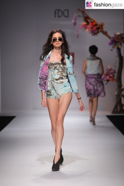 The funky digital prints were predominantly seen in quilted jackets; sheer chiffon tops teamed with high-waisted shorts as well as jumpsuits with centre-front opening and added sleeve details. Later, purple made way for yellow and grey in body hugging suits and straight fit dresses.