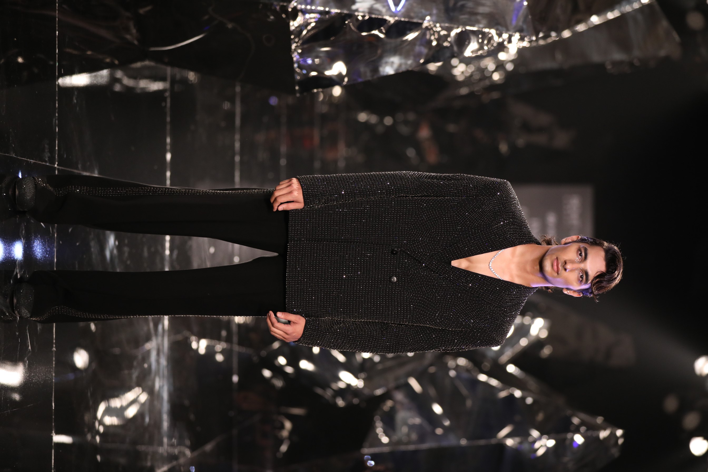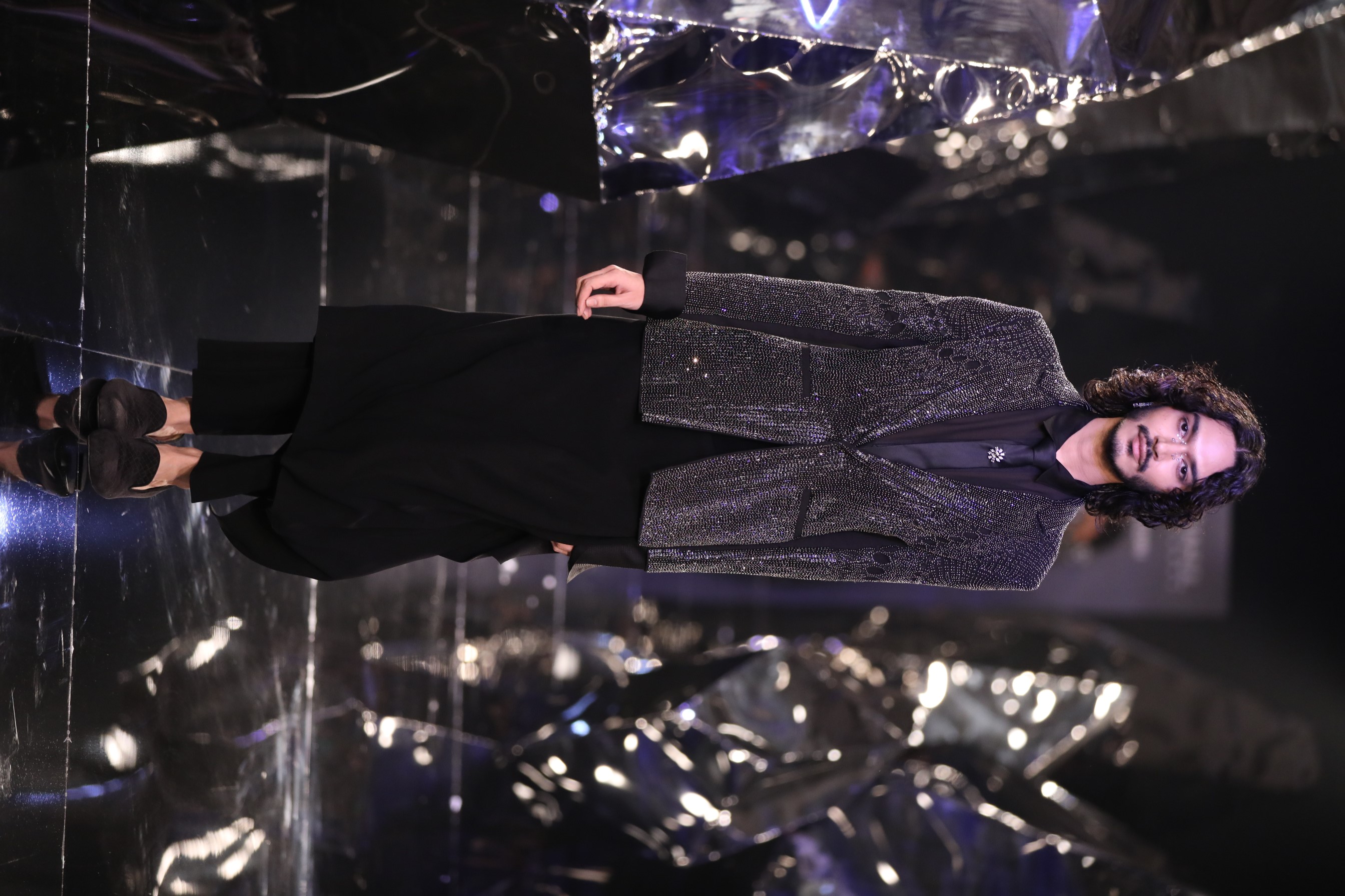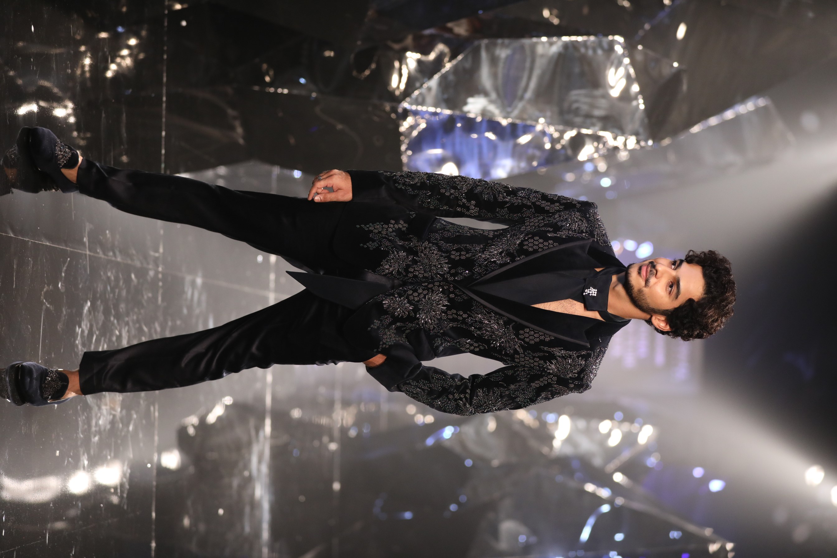 Ishaan went shirtless on the ramp in a tailored black blazer featuring intricate shimmering embroidery, padded shoulders, full-length sleeves, notch lapel collars, and front button closure. He completed the outfit with matching black satin pants featuring straight-leg fitting.