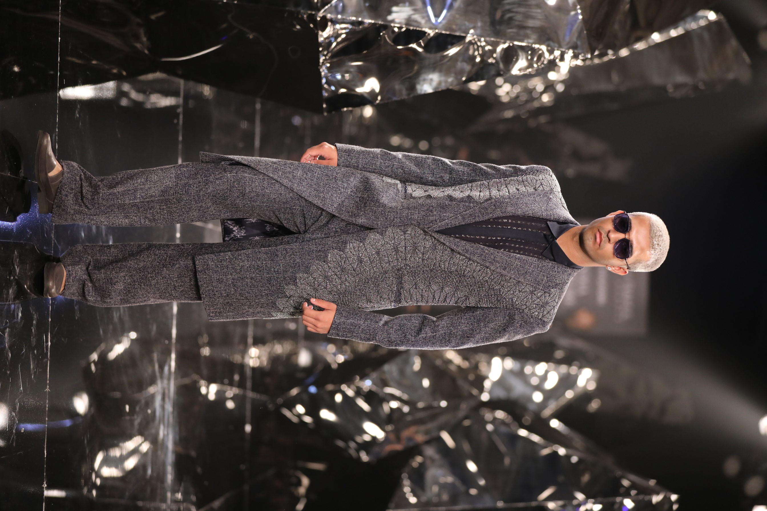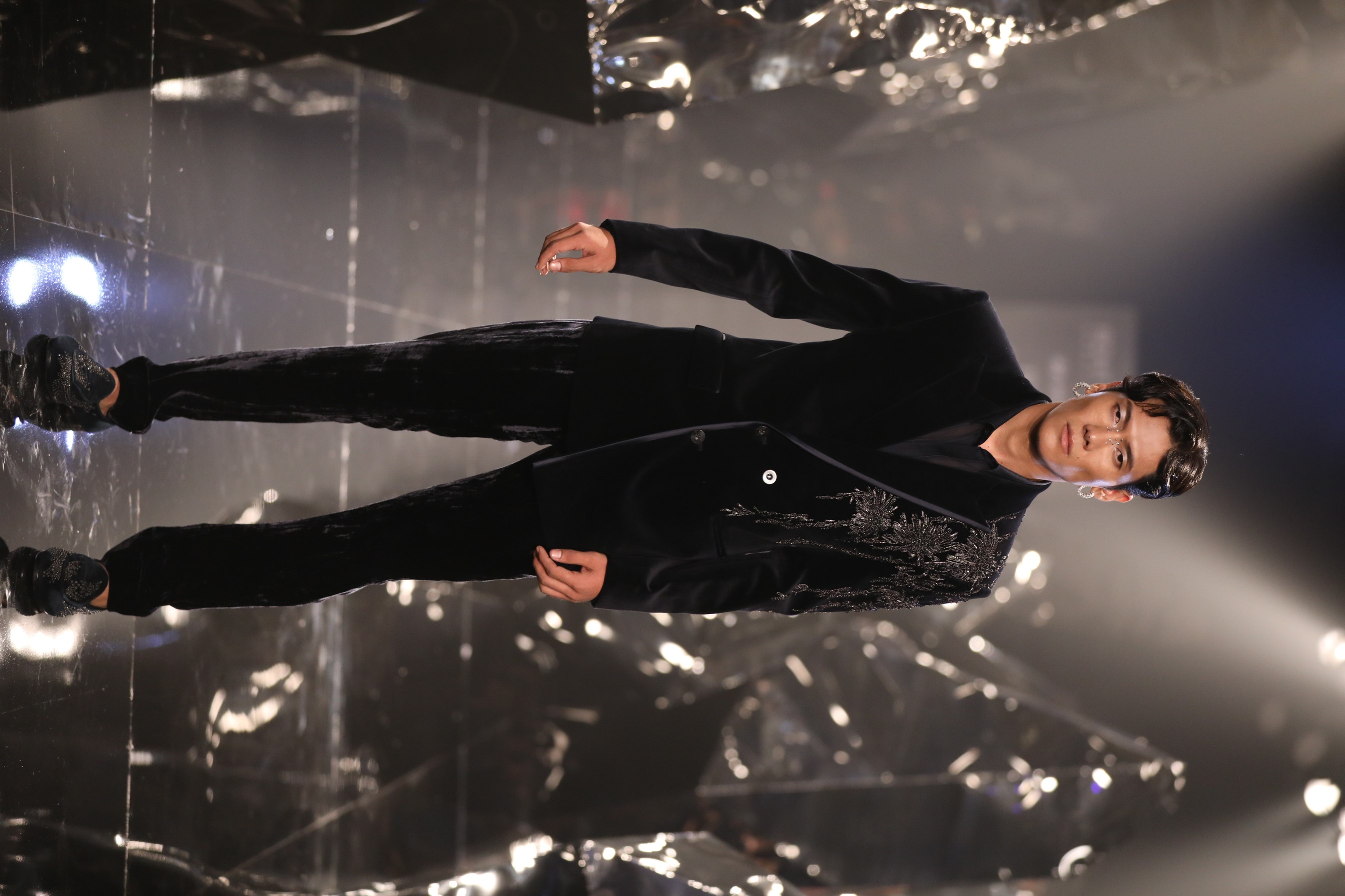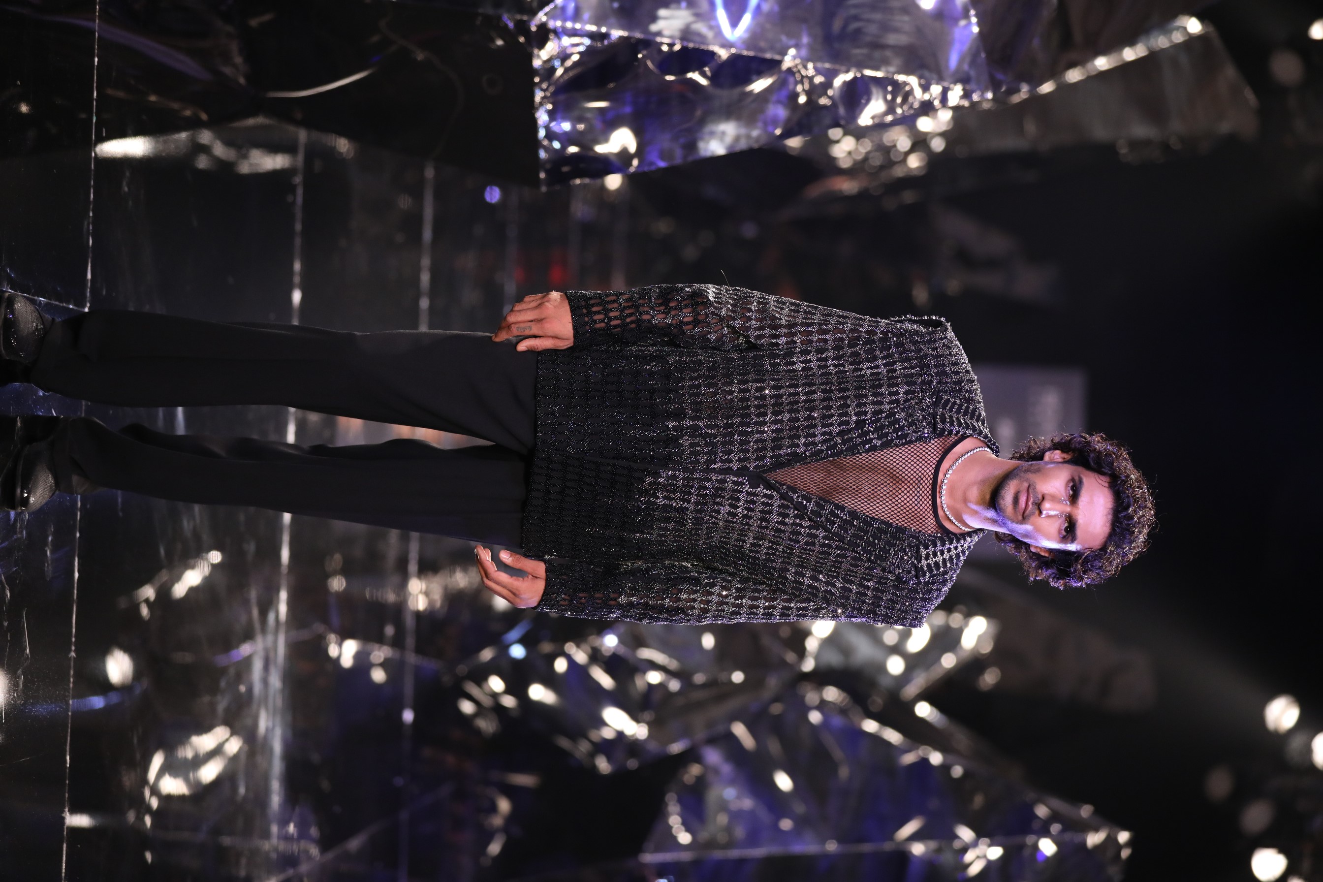 Ishaan went shirtless on the ramp in a tailored black blazer featuring intricate shimmering embroidery, padded shoulders, full-length sleeves, notch lapel collars, and front button closure. He completed the outfit with matching black satin pants featuring straight-leg fitting.