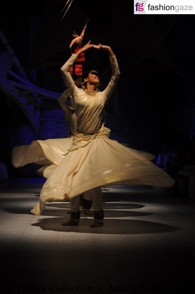 . The collection-‘The Maharaja of Madrid’ is about a factitious voyage of a Monarch who was fascinated by the Spanish art, customs and forms. JJ Valaya’s show was presented by the AMR group. The whole set designed by Schenographer Sumant Jayakrishnan was extravagant and grand in every aspect. It was a visual treat for the audience who were mesmerized by the whole ambiance of this visual spectacle. Big white royal umbrellas were set, which depicted the scene of some king’s court, with models sitting on the thrones wearing white ensembles and chunky Indian jewellery, like king and queens of Mughal Era