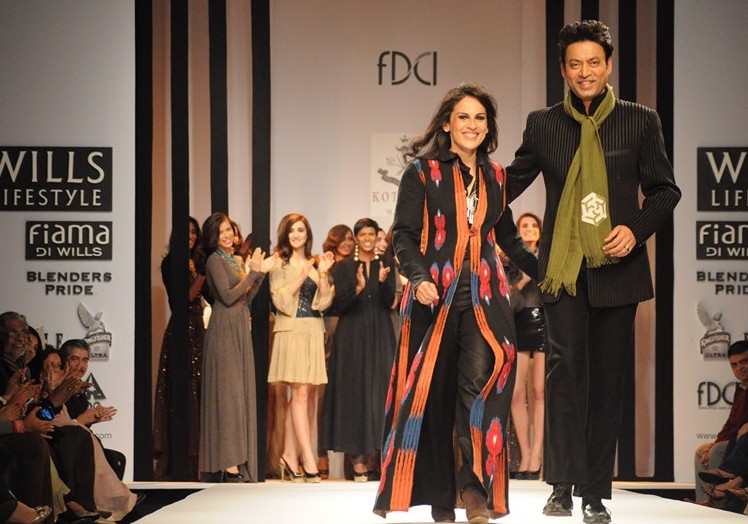 Irrfan,Khan who wore a black and grey bandhgala teamed up with a green muffler, walked confidently on the runway and also shook a leg with the models in the end. Irrfan said, “I am honoured to be part of Meera’s collection. I was just mesmerised by the whole concept of the designs. I was happy while walking on the ramp with the models. I enjoyed it completely. Meera designed this attire after seeing saw my look in ‘Paan Singh Tomar’,”.