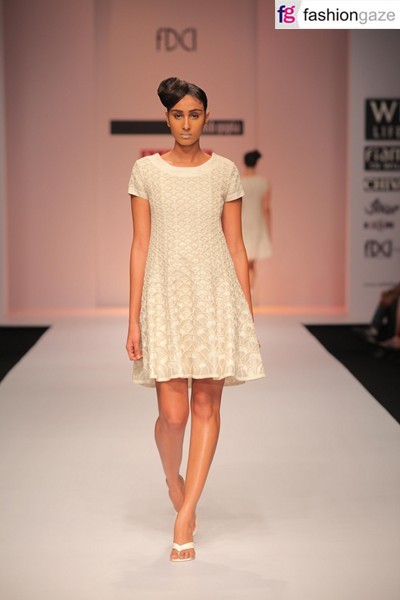 The show commenced with a series of knee length ivory dresses with cap sleeves embellished with bead and buttons in the form of diagonal stripes, swirls, circles, which later transformed into floral motifs. A pleated dress in ivory had intricate button details at the hem while a shift dress with pink thread-work looked astonishingly elegant and chic. The show concluded with unique weaves engraved out of impeccable craftsmanship.