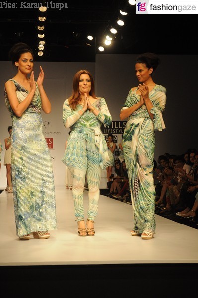 Reynu Tandon’s Spring Summer 2012 collection was full of ultramodern resort wear garments for all those cheerful and fun-loving women. The collection showcased a range of garments in varied lengths in an assemblage of whites with hues of blue. Reynu’s prints were a great fusion of ultra-feminity and sexiness. The show started with a full length printed dress that had thigh high slit followed by a jumpsuit with halter back and minuscule black ruffles. The fluorescent prints on a white base prolonged in a saree combined with half-sleeve blouse. A white top with flared sleeves had intricate surface texture while a pair of shorts crafted out of the same fabric created a statement when it was teamed with flowy sheer chiffon top. Abundance of thread work and beads was seen in printed sarees and jumpsuits in tones of blue and blue-grey. Blue prints went on to adorn neckline yokes in white cutwork dresses. A range of glittering outfits with sequinned surface put an end to the show in fresh tones of lime, blue and green.
