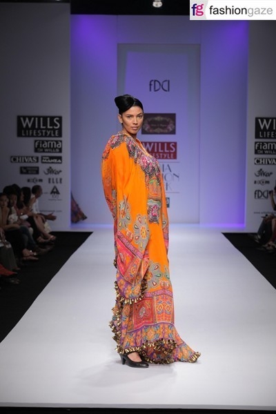 The designer chooses to portray Spring Summer 2012 mood with bolder and louder prints, which are ornamental emphasising the neck and hems. The pallete moved swiftly across purples, pinks mustards and blacks. Also, the gold foil print over solid surfaces was evidently visible. There was a warm energy visible throughout the collection, which comes through a positive play of colours. The ornamental prints grew all over the shapes and silhouettes. They played invariably in different moods appearing naughtier.
