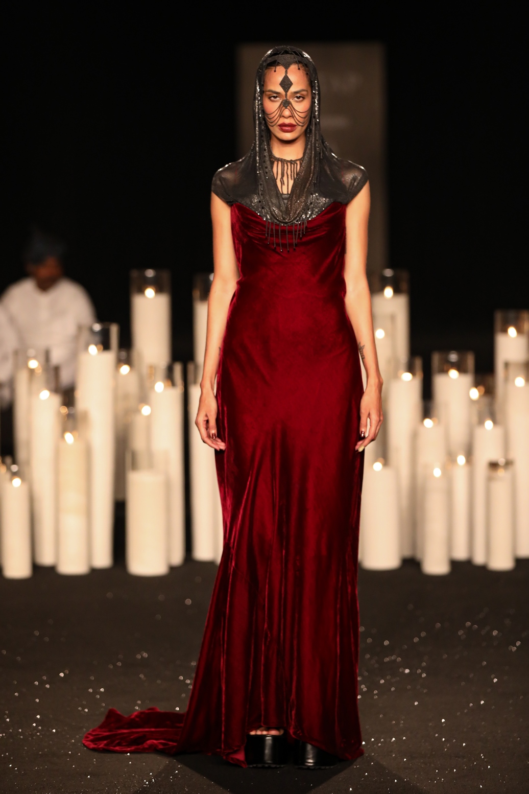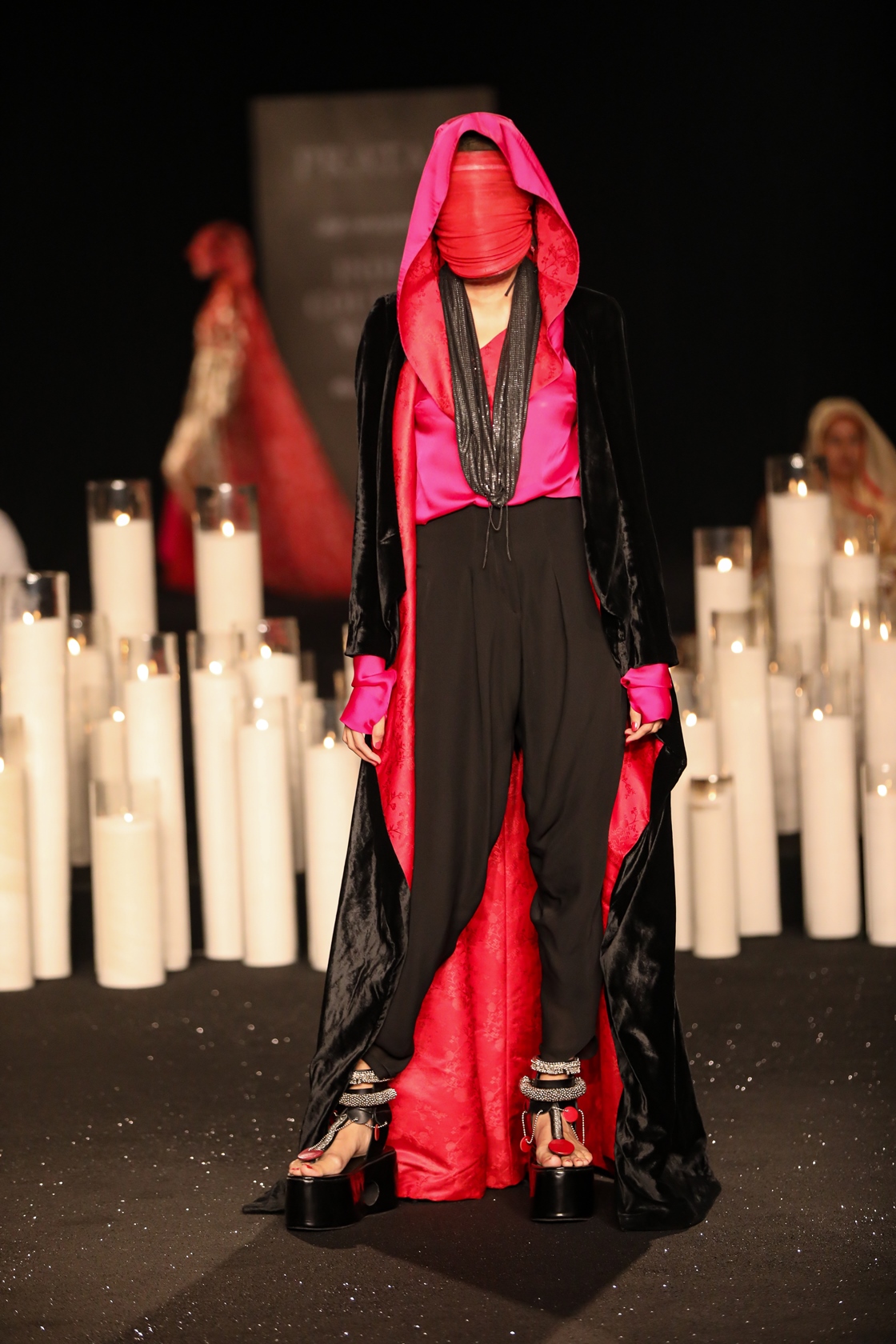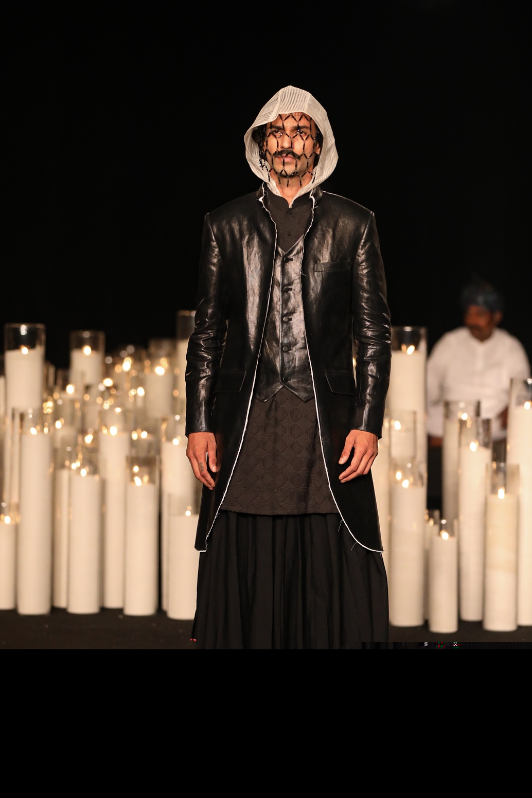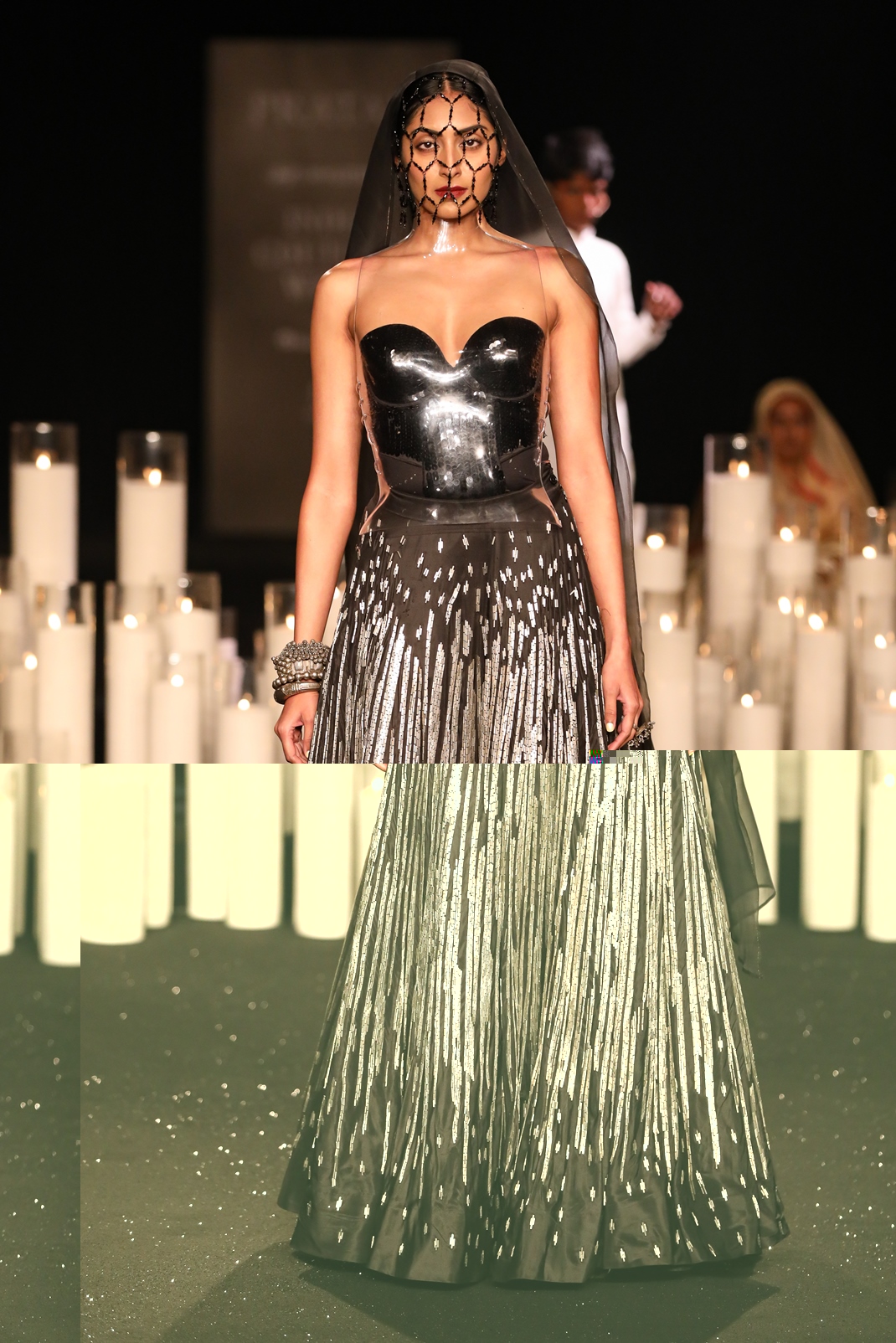 We stand in the present, acquiring from the past and looking to the future. A collection that speaks to the non-conformist, willing to embrace the uncustomary. A play of optics and the use of woven gold, silver, pastels and jewel tones. Custom made jewellery and hand-made footwear with metallic elements accessorize the look. In the shadows of shapes, we play. Some glitter in the dark. Some respite. Reverberating with the sounds of the Thar.