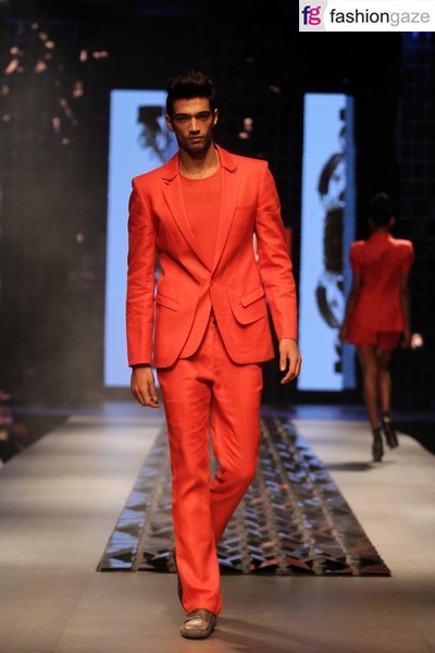 The designer duo brought a futuristic palette of translucent surfaces for Spring Summer 2012. The palette was portrayed larger than life with an impactful pool of grey, white, black and red. Most important part of the collection was random play with the lapels on jackets, shirts and waist coats. Over all a very formal look was maintained throughout. The surfaces looked pristine. Repetitive fringes were arranged to look like fish scales. The white and lack chemistry was played over again and again to look the best. There was great drama incorporated in the garments. See through surfaces were combined with opaque ones. A dream-like scene was created through backdrop music and mystical set. The sharp edged embroidery details suited the bases. At places stretchy surfaces in gunmetal shades looked impeccable. Rohit and Rahul’s ace color mixing skills gave new dimension for the season.The crafted, draped and tacked looks were amalgamated brilliantly.[tab:Photo Gallery]