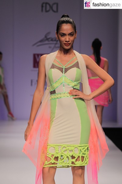 A neutral base colour palette injected with plenty of neon effect and hints of tangerine form the epicentre of Ankita’s Spring Summer 2012 clothing line. Lights went down as models clad in corset dresses were popping in neon shades of tangerine and fluorescent in this ‘Tangy Candy’ inspired collection. The electric shades of tangerine and fluorescent moved to other elements such as spaghetti straps or ombre-dye effect in beautifully crafted short corset dresses. Rope-like elements were coiled around in sleeves and neckline before renovating themselves itself into an entire dress in tangerine with hints of pink at hem. Appliqué was another notable element judiciously used in body hugging dresses in nets and lace. A blue dress in lace was combined with brown drapes at waist, which was flowing and swinging as the model walked down the ramp. The show concluded with a play of neon lights on the garments in dark.