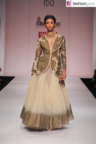 The Royal WeddingSamanth Chauhan has recited a dramatic wedding tale in typical Rajput style with men clad in bandhgala and red turban as the enchanting music and chanting of mantras evokes you spiritually. The designer has drawn his inspiration from the Victorian nude, beige, brown and white – a clear shift from the usual bright colours that define ethnic Indian influence on Rajputana gharanas during the colonial rule. He has instead used Rajputana zardozi hand embroidery fused with Victorian motifs, which are predominantly found in the collection.