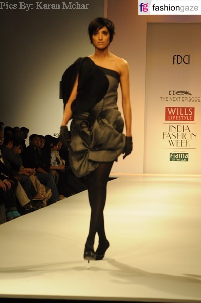Fabrics which have been used are Silk taffeta, Silk CDC n Satin, Felt, cotton-wool and Silk Velvets etc just to create layers of ice like surface and at the same time creating a smooth and waxy effect like a penguin skin, blending it together to give a complete a whole look and story.