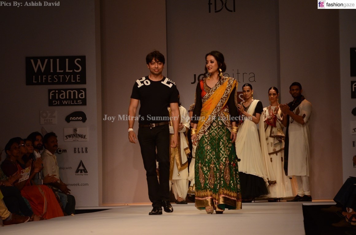 Joy Mitra’s Summer /Spring 2014 collection dedicated to director Rituporno Ghosh. Bollywood noted actress Raima Sen dazzled the ramp as a show stopper for Joy Mitra . Raima Sen walked on the ramp in mixed colour lenha choli and duptta .