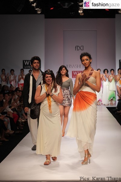 Urvashi Kaur emphasizes the element of fluidity in her Spring Summer 2012 collection. By using knits and hosiery surfaces, she celebrates sense of freedom for the contemporary woman. The collection combines refined constructed silhouettes with free drapes—a feature that is very much indigenous when slightly twisted and exudes a western appeal. The shapes were bold and provocative. The colours were mainly off-whites, timidly treated with pastel blues, pinks and browns.