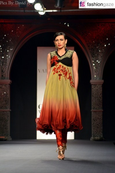 Varun Bahl Kick started the famous Coture Fashion Week 2012-13 at Taj Palace Hotel New Delhi. This time theme of Varun collection is inspired by Indian new young generation. He has used lot of black colour as a key color , Varun Bahl’s statement against the preconceived inauspiciousness of it, as black ads a modern relevance to the time-honored, traditional cuts and shapes this collection is based on. The other key colors in the collection are cobalt-to-navy blues, olive, coral, and reds.